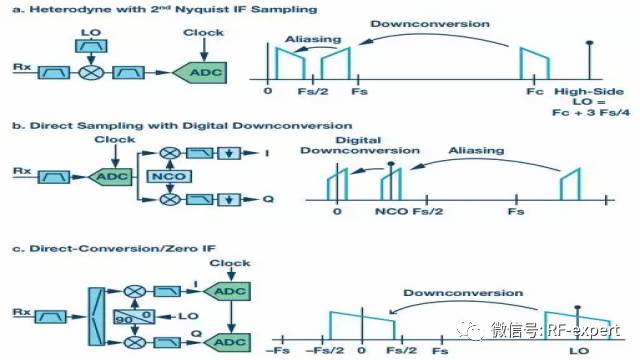 图a为外差接收机示例,高端LO将工作频段混频到ADC的第二奈奎斯特区。信号进一步混叠到第一奈奎斯特区进行处理。