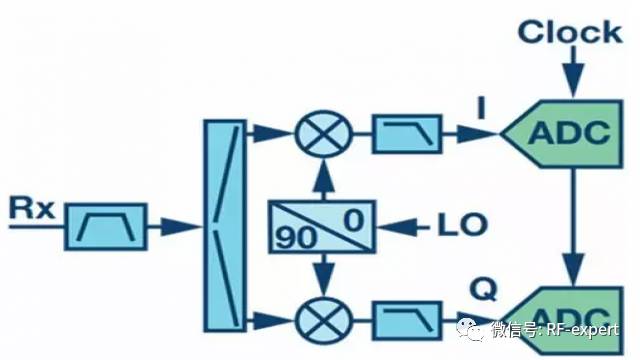 图c为直接变频接收机示例。双通道ADC与正交解调器对接,通道1对(同相) I信号进行采样,通道2对Q(正交)信号进行采样。
